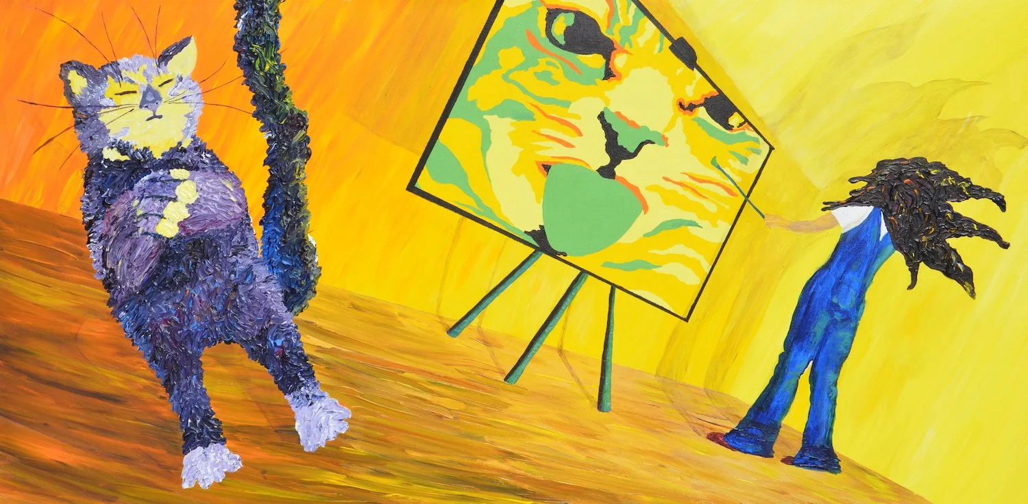 "He wanted to look like a cat with some clout, so Alice painted him with his tongue sticking out”. acrylic on canvas illustration